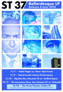Since their formation in January of 1987, Texas psych/space rock legends ST 37 have released 15 full length studio albums in various configurations including 14 CDs, 4 double LPs, 6 LPs, 5 7″ 45s, 1 12″ 45, 8 CDRs, 3 double CDRs, 9 cassettes, and 1 mini CD, and have appeared on over 45 compilations and collaborations on labels ranging from Emperor Jones and RRR to Cleopatra and Noiseville. They’ve played over 600 shows and toured extensively all around the United States and Canada. The band has shared the stage with artists like Sonic Youth, Acid Mothers Temple, Faust, Bardo Pond, the Butthole Surfers, Hawkwind, Nik Turner’s Space Ritual, Chrome, Guru Guru, Rocket From the Tombs, Helios Creed, Indian Jewelry, Suisho no Fune, and many more as well as playing festivals like Terrastock, SXSW, Saturnalia, Bayou Psych Fest, Levitation/Austin Psych Fest, Strange Daze, Weedstock and Flaxfield. They have scored and performed live original soundtracks to the Fritz Lang films Metropolis and Destiny (Der Mude Tod). Their current lineup reads like a veritable Who’s Who of contemporary southern and western American adventurous music; newest member Matt Turner (Quttinirpaaq, Shit and Shine, beesareblack) joins Bobby Baker (Baby Robots, Rubble, Game 4), Bob Bechtol (Seven Inch Stitch, Thanatopsis Throne) and longterm stalwarts SL Telles (My Education, Bahrain, Vast Majority, American Vodka, Die Krupps, Guru Freakout), Joel Crutcher (Abigail und Hansel, the Organians) and Lisa Cameron (Venison Whirled, Three Day Stubble, Roky Erickson’s Evilhook Wildlife E.T., Brave Combo, Pat Travers Band, Moist Fist, Glass Eye) to create music unlike anyone else’s.
